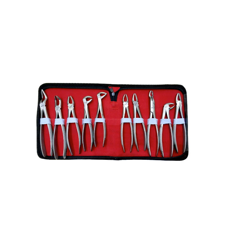 Presentación: Kit x 10 forceps: N° 2 – Para incisivos y caninos superiores. N° 7 – Para premolares superior. N° 13 – Para caninos y premolares inferiores. N° 17 – Para molar superior derecho. N° 18 – Para molar superior izquierdo. N° 51 – Para raíces superiores. N° 67 – Para terceros molares superiores. N° 74 – Para raíces superiores. N° 73 – Para molares inferiores. N° 79 – Para terceros molares inferiores.