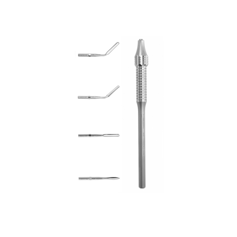 El kit de periotomo de Medesy es un instrumento completo y eficaz. Estácompuesto por un mango con 4 hojas distintas intercambiables. eficazmente afiladas.pero al mismo tiempo delicadas. para lograr el corte de la encía y del ligamentoperiodontal. además de para garantizar una extracción atraumática del dientesin comprometer ni dañar la fosa alveolar circundante.