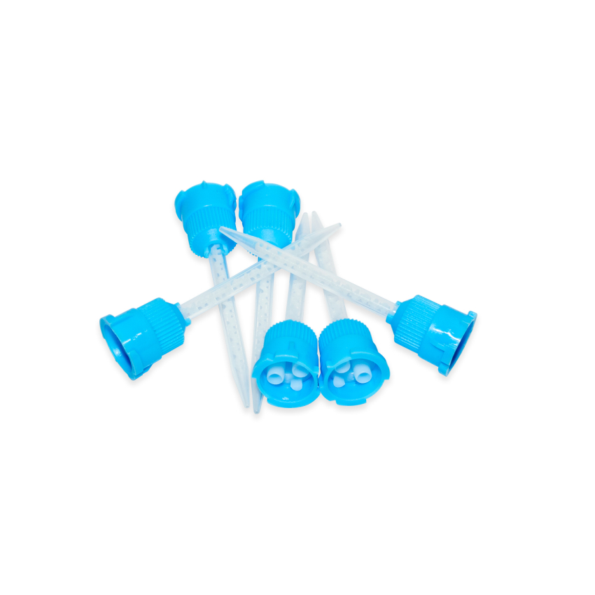 Puntas mezcladoras para silicona celestes.
